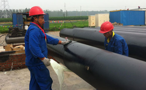 該項指標主要控制施工時的缺陷或膠帶存在的某些缺陷, 必須對管道進行全線檢查。檢漏電壓與石油瀝青檢漏公式相同。檢漏儀移動速度不超過0.3m/s,對所有放電處應作記號,并用膠帶修補。對檢測結果應做好記錄,內容包括缺陷形狀,性質及位置,修補工藝等,作為管道竣工資料。